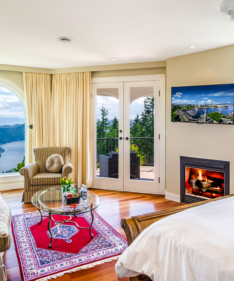 Nestled at the highest perch of the resort, our Cielo Two-Bed Junior Suites offer an elevated escape. Outfitted with a king and queen bed, the suite offers space for friends or family, plus all of the luxuries of a mountainside retreat: a spa-inspired, six-piece bathroom, oversized soaker tub, fireplace and balcony to soak up the views the Saanich Inlet and Olympic Mountains.