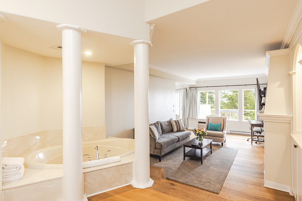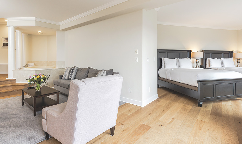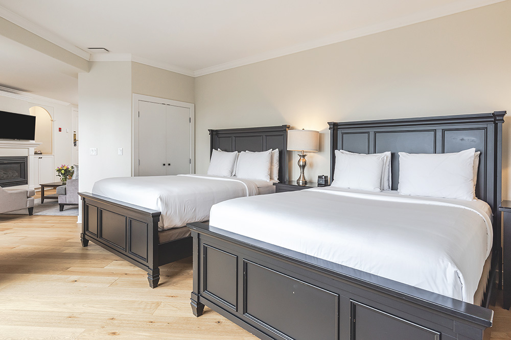 Tuscan-inspired with columns and contemporary finishes, our unique Master Double Suite invites the outdoors with wide windows opening onto the lust temperate forests surrounding the Resort. Slip into the rain shower, sink into an oversized, two-person tub with aerators or sit fireside with a glass of wine. With two queen beds, this room is ideal for large families or small group getaways.